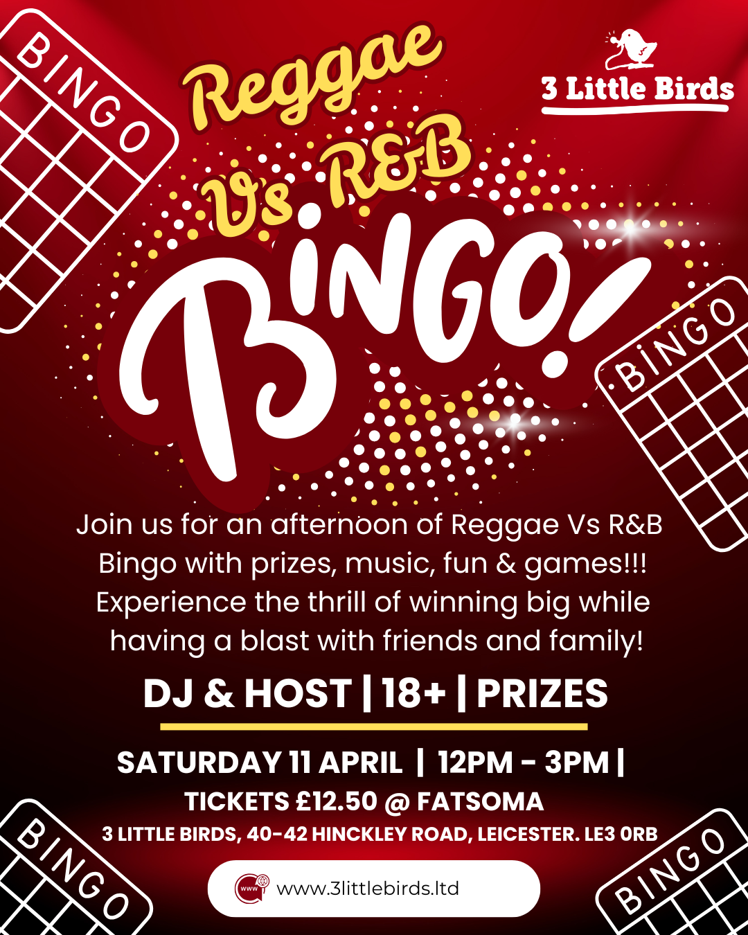 It's the ultimate showdown – Reggae vs R&B Bingo is coming to 3 Little Birds! Grab your mates, settle the debate once and for all, and compete for epic prizes while vibing to the best sounds. Whether you're Team Bob Marley or Team Usher, this is your moment. Expect good company, flowing cocktails, and an afternoon you won't forget. Limited spots available – book now and bring the good vibes!"