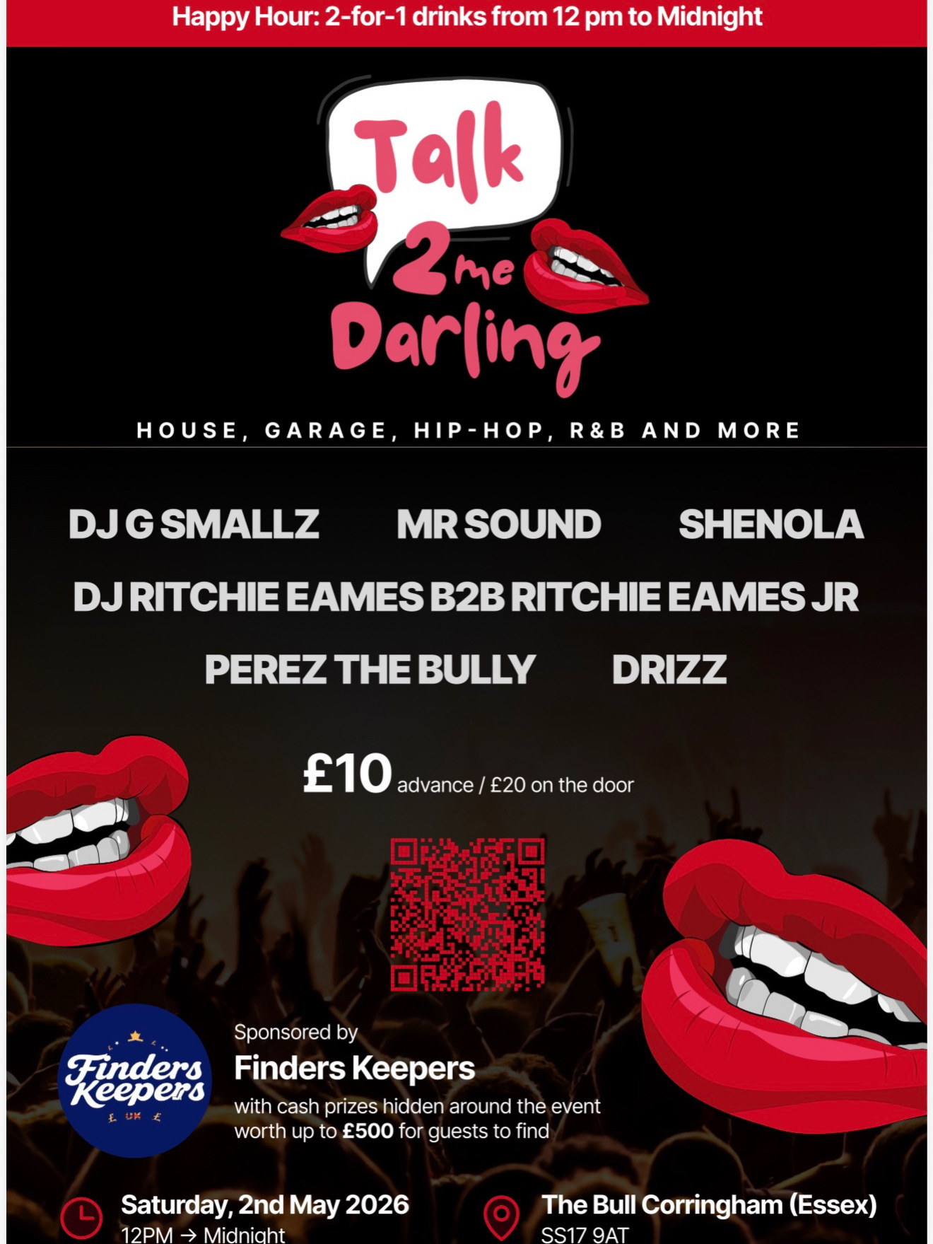 Talk 2 Me Darling lands on Saturday 2nd May at The Bull Corringham and we’re shutting it down from 12PM till midnight!