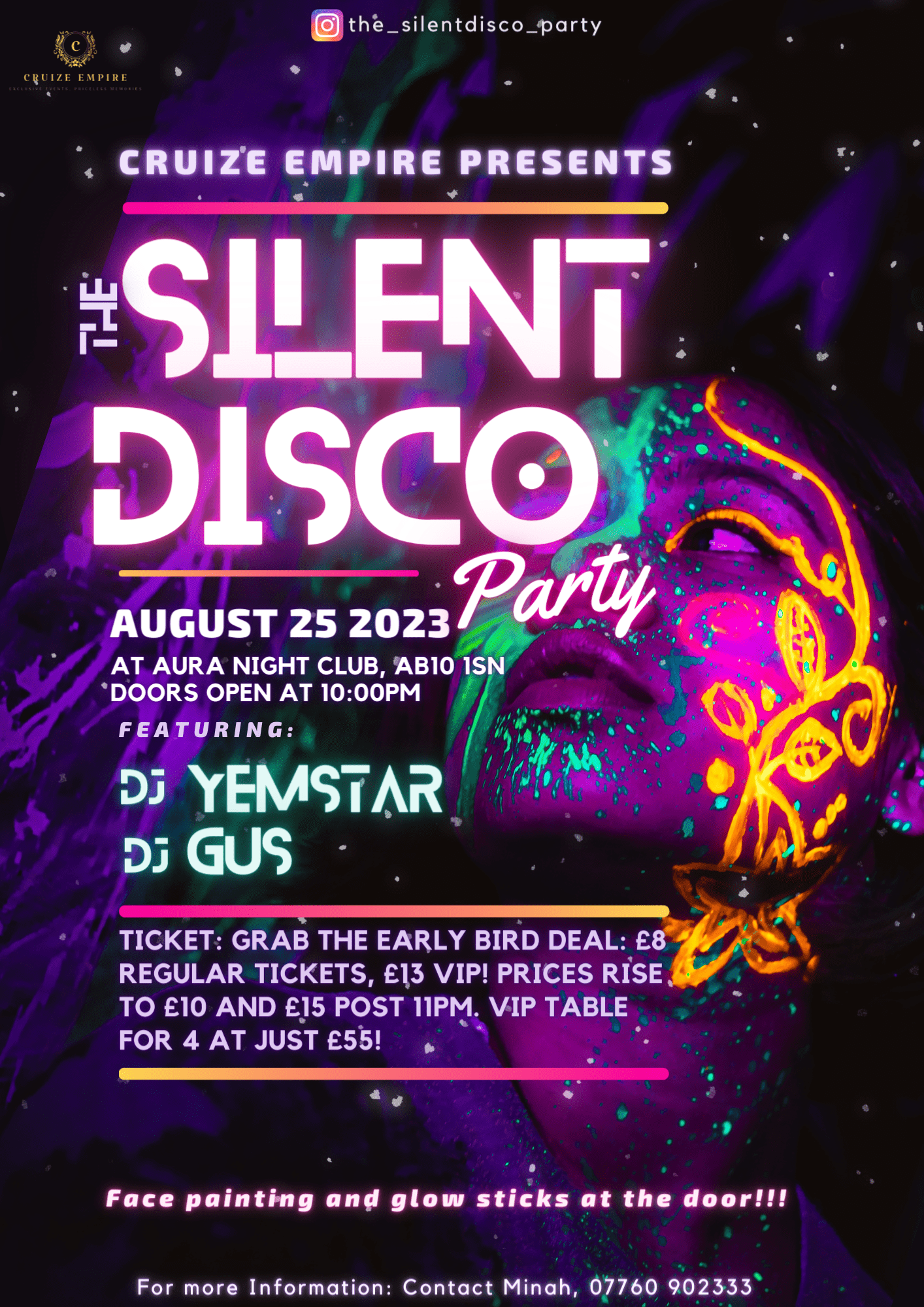 Get ready for an unforgettable night on August 25th at Aura Nightclub (AB10 1SN) with our 'Silent Disco Party'. Immerse yourself in a night filled with the dynamic rhythms of Afrobeats, Amapiano, and Hip Hop as you connect and network. Enjoy the thrill of the silent disco with our wireless headphones. Early bird tickets are available at £8 for standard entry and £13 for VIP until 11 PM, after which they increase to £10 and £15. For an elevated experience, secure a VIP table for 4 at a special price of £55! Don't miss this extraordinary blend of networking and fun. Book your tickets now for an unforgettable experience!