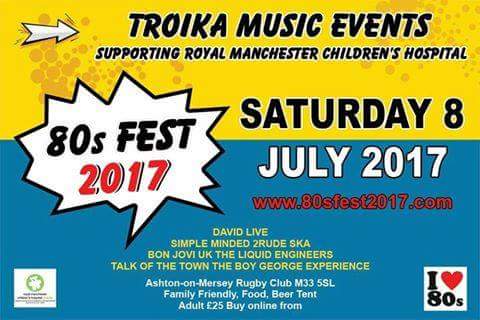 Manchester's original 80s tribute festival. 2017 and we're supporting Royal Manchester Children's Hospital. Saturday 8 July at Ashton on Mersey rufc. 10 hours of top 80s tributes with headliners David Live, THE tribute that Bowie's bans like. Advance tickets available until midnight Friday. OTG prices will be slightly higher.