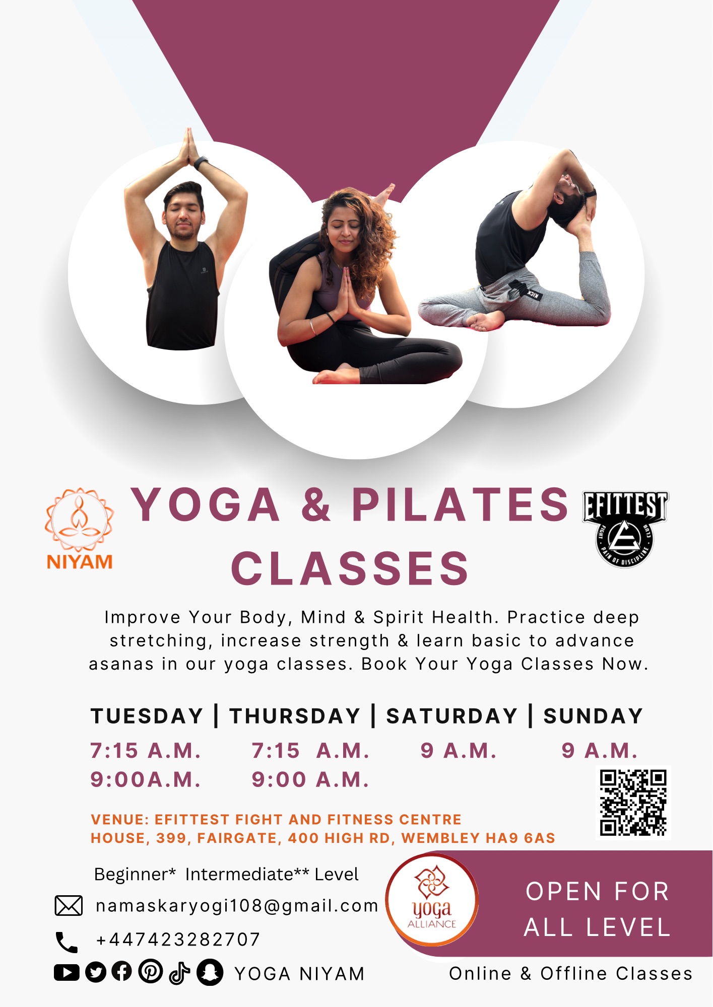 Join our invigorating Yoga & Pilates classes held at the prestigious EFITTEST Fight and Fitness Centre in Wembley.