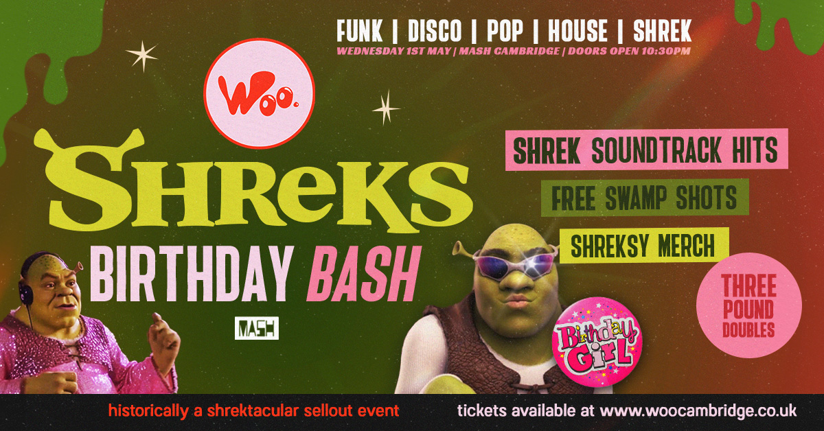 shreks birthday bashgirlies , our favourite ogre is celebrating his 20th birthday this year ! and he's invited all of you to come and get shreked at woo x